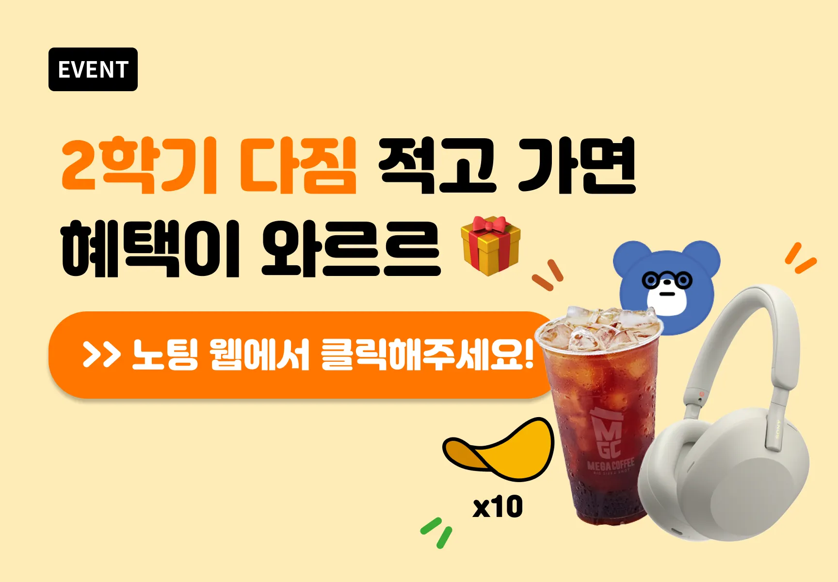 2학기 개강을 맞아 노팅 이용자들을 위한 ‘2023 2학기 개강 이벤트’를 진행합니다. 설문 폼을 통해 2학기 다짐 메세지를 남겨주시는 이용자들을 대상으로 ‘소니 헤드폰’, ‘메가커피 커피 쿠폰’, ‘칩(노팅 내 재화)’를 경품으로 증정합니다.