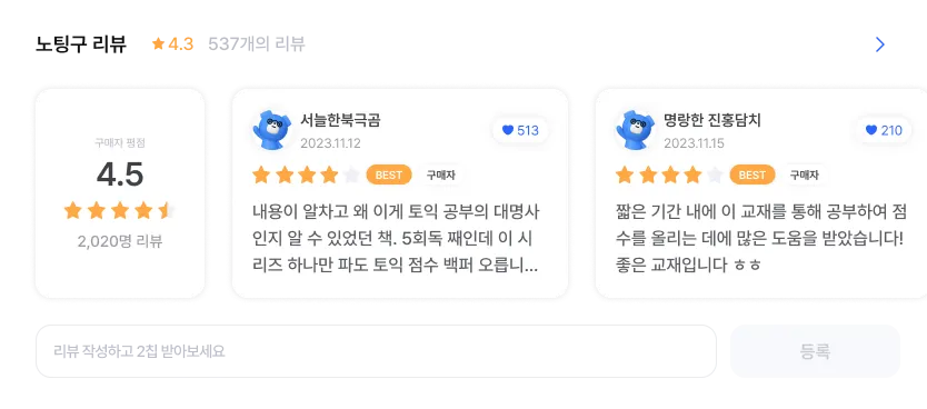 도서에 대한 독자들의 의견을 수집할 수 있는 리뷰 및 평점 시스템을 추가하였습니다.기본적으로 모든 노팅 유저가 자유롭게 리뷰를 작성할 수 있으며, 평점에 영향을 주는 리뷰는 '실 구매자'가 작성한 리뷰의 평점입니다.