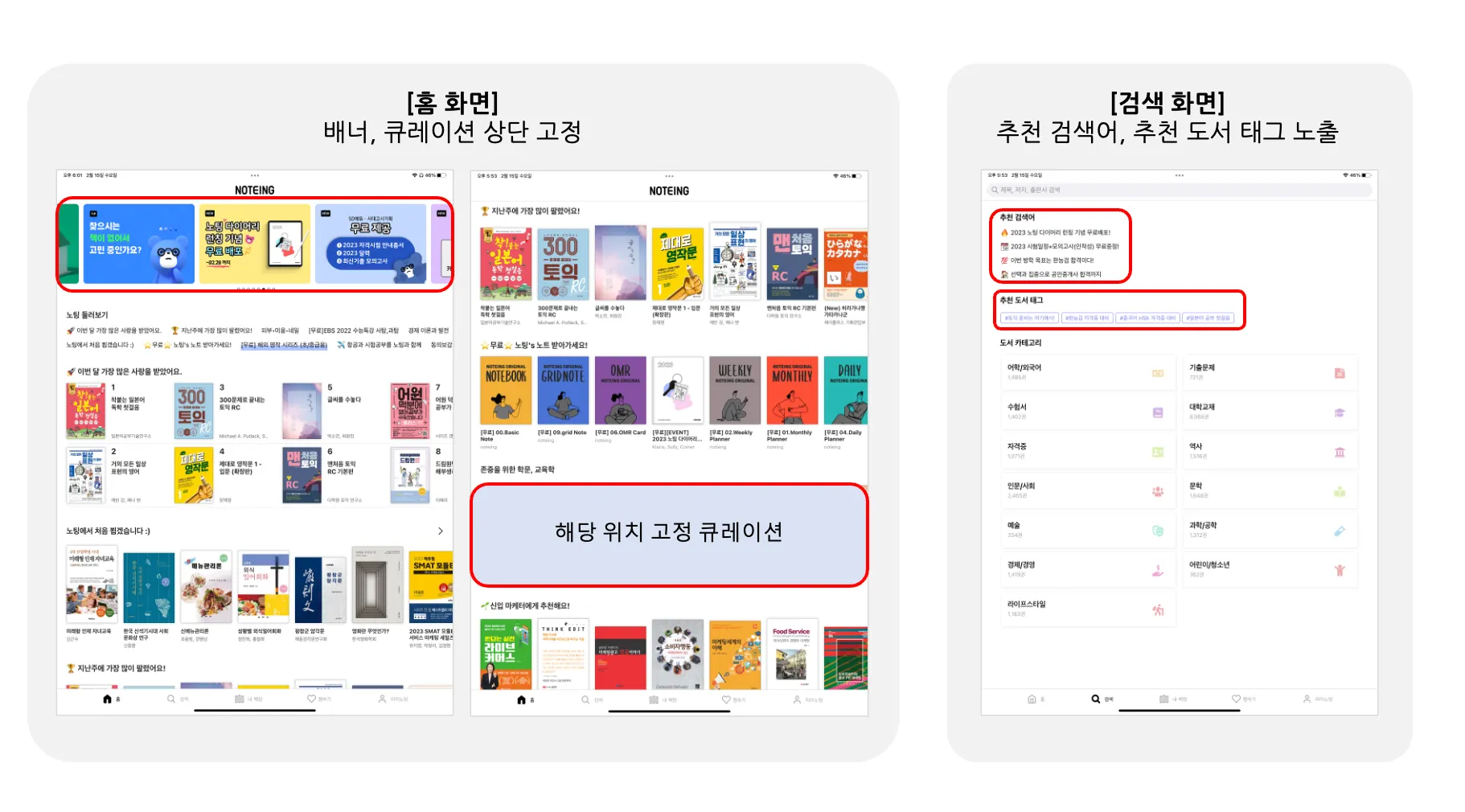 검색 탭 → 추천 검색어 or 추천 도서 태그 상단 고정